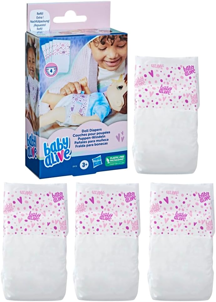 · FRALDAS EXTRA PARA BONECAS: Este kit com 4 fraldas para boneca é ideal para as bonecas Baby Alive (bonecas vendidas separadamente e sujeitas à disponibilidade)