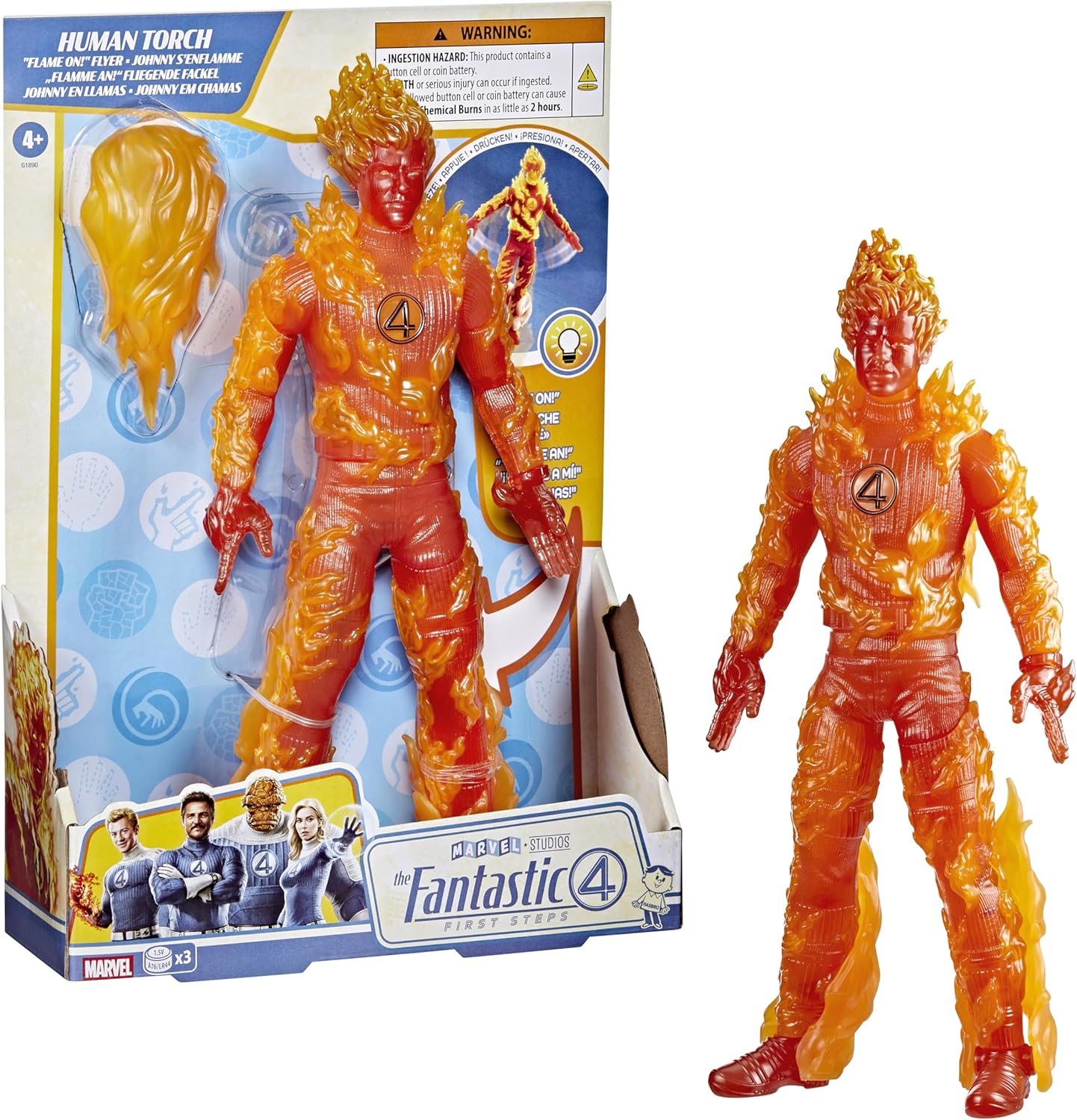 Imagine aventuras cósmicas com o brinquedo Marvel Tocha Humana "Flame-On!" Flyer da Hasbro! A hora da brincadeira ganha um impulso flamejante com esta figura colecionável com articulações básicas para brincadeiras com poses. Dobre as chamas esculpidas nas pernas inferiores para imitar a trilha flamejante icônica do Tocha Humana, depois aperte as pernas para ativar o modo de voo “Flame-On!”. Crianças a partir de 4 anos podem continuar apertando para alternar entre cinco efeitos de luz diferentes! Com design inspirado no filme Marvel Studios "Quarteto Fantástico: Primeiros Passos", parte do MCU, é ideal para recriar cenas favoritas e imaginar novas aventuras. Descubra mais brinquedos Marvel para colecionar, incluindo figuras, veículos e acessórios de roleplay! (vendidos separadamente. Sujeitos à disponibilidade.)
