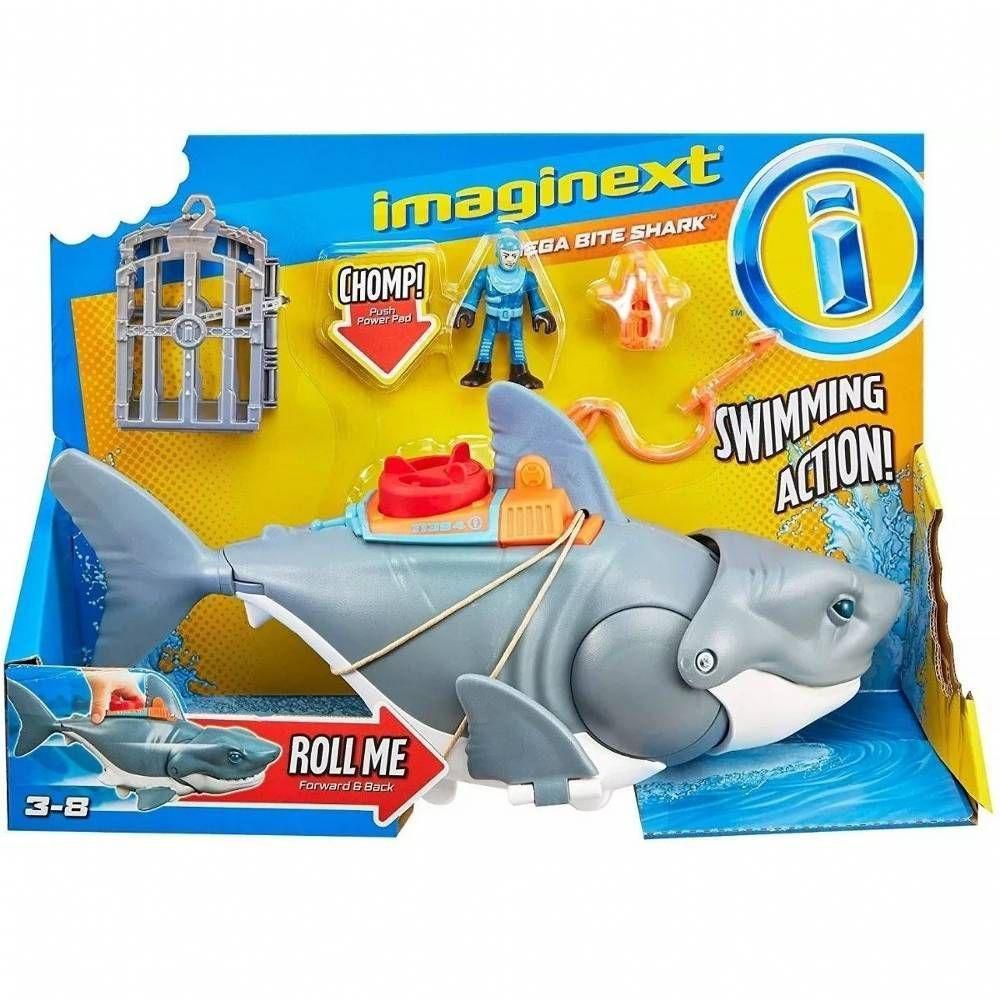 Conjunto super mordida assustadora do tubarão, com um mergulhador e uma jaula de Imaginext, Mattel . As crianças podem criar fantásticas aventuras subaquáticas com este tubarão de brincar, que apresenta um movimento de natação realista e uma ação de mastigação. Veja o tubarão abrir e "engolir" o mergulhador, em seguida, recuperar a figura da porta na parte de trás. Grande tubarão de brinquedo com figura de mergulhador, gaiola e acessórios.