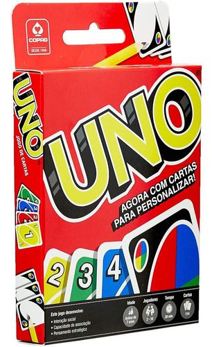 É fácil começar.. É impossível parar! O Jogo Uno Copag é facilmente um dos jogos de cartas mais famosos do mundo! Ideal para pessoas de todas as idades é um jogo para a família muito divertido, que aproxima pessoas e desenvolve capacidade de associação e pensamento estratégico. O Jogo Uno é diversão garantida para família e amigos! E para deixar ainda melhor, essa edição traz uma super novidade: três (3) cartas para personalizar e mais uma (1) carta extra que adiciona uma nova regra ao jogo! Livre-se depressa de suas cartas, combine cores e números e use as cartas de ação para atrapalhar os seus oponentes. Quando você tiver apenas uma carta na mão, não se esqueça de gritar “UNO!” O Jogo Uno Copag contém 114 cartas em cartão no formato 56 mm x 87 mm.