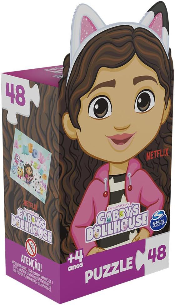 O Puzzle Gabby's Dollhouse de 48 peças é inspirado na adorável série de desenhos animados. Esse quebra-cabeça transporta quem o monta, para o mundo mágico da casa de bonecas da Gabby. A embalagem especial é prática e charmosa, com orelhinhas fofas projetadas para fora, que permite uma fácil identificação do produto! Junte-se a Gabby e seus amigos nessa experiência encantadora!