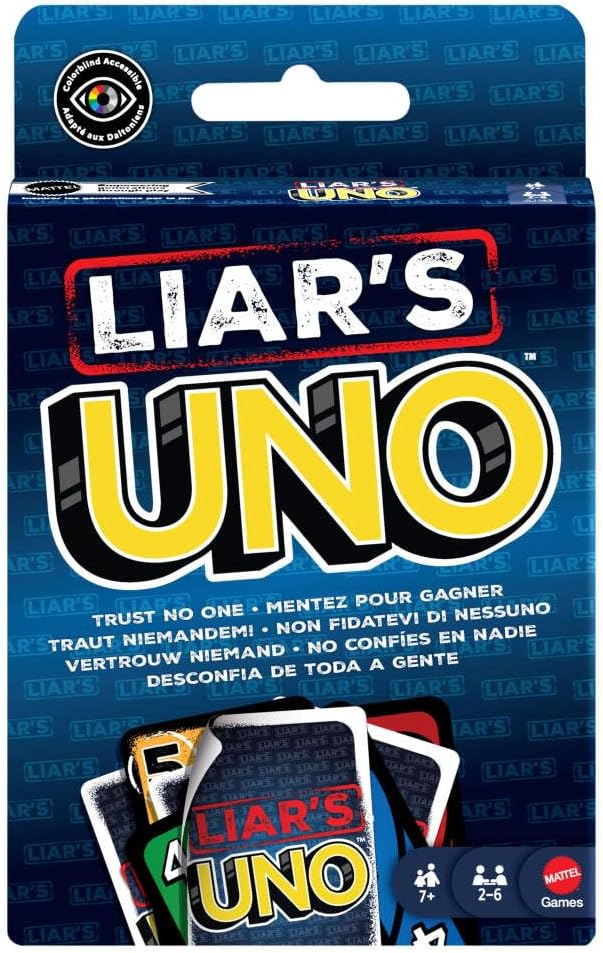 Os fãs de UNO vão se divertir muito com essa nova versão do clássico jogo de cartas, no qual vale mentir, e só os mais cheios de lábia vencem! Nessa edição, a “Carta do Mentiroso” é jogada VIRADA PARA BAIXO, e o jogador anuncia qual carta está jogando. Será que ele está dizendo mesmo a verdade ou blefando? Se alguém o desafiar e ele estiverem mentindo, ele compra uma carta. Mas se ele estiver dizendo a verdade, quem acusou é que compra! Para ganhar, faça cara de paisagem, esconda seus sinais e, quando restar uma carta, não se esqueça de gritar “UNO!”. Um presente incrível para fãs de jogos de cartas a partir dos 7 anos de idade. Cores e detalhes podem variar.